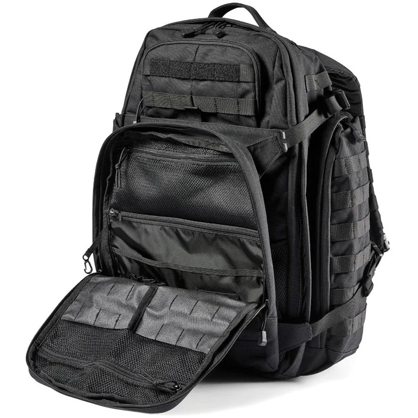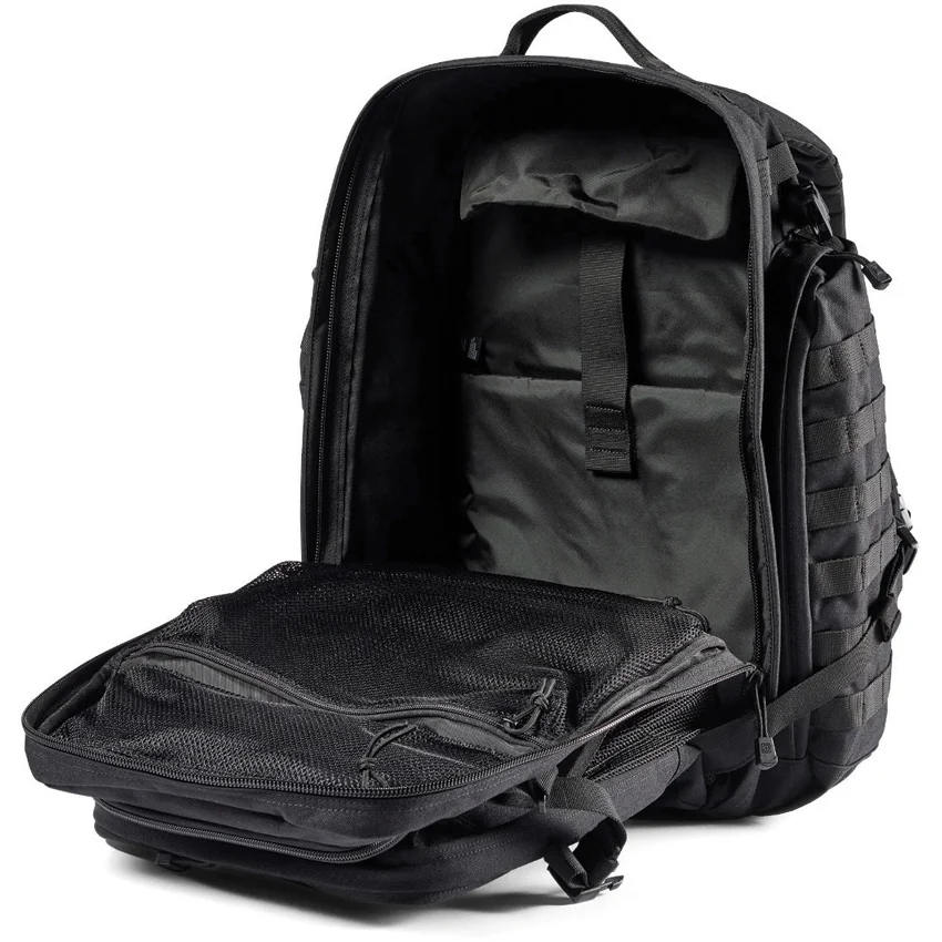 55 liter capacity. Main compartment: 23″ x 13.5″ x 8.5″. Front pocket: 15.5″ x 11.5″ x 2″. Hydration pocket: 21″ x 13.5″. Left and right side pockets: 16.5″ x 6″ x 1.75″. Fits up to 15″ laptop. Signature Center Line design. External front and side web MOLLE with 3″ x 3″ loop. Fleece-lined eyewear/media pocket. Dual external side zippered pockets. Hidden CCW compartment with loop panel. Contoured yoke shoulder strap system with MOLLE webbing. Shove-it compartment with side gussets. Reinforced back panel with aluminum stay bar and waist strap. Generous MOLLE attachment points. 1050D nylon construction. Color: Black. Bulk packed. May not ship International.