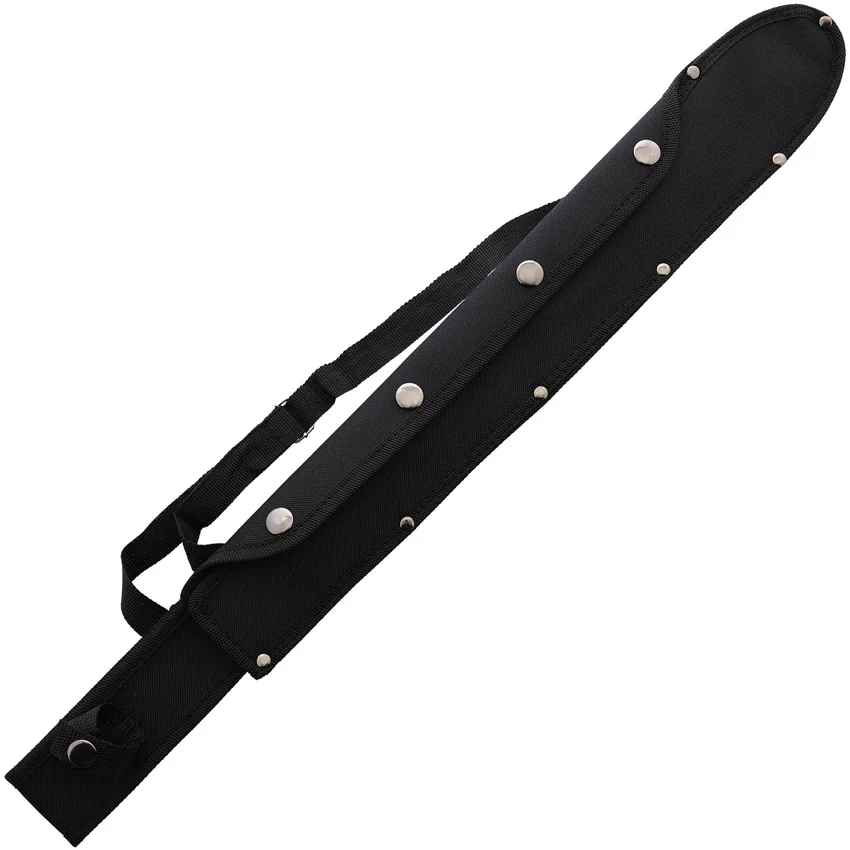 24.75″ (62.87cm) overall. 19″ (48.26cm) double edge stainless blade. Brown wood handle. Full tang. Black nylon belt sheath. Boxed.