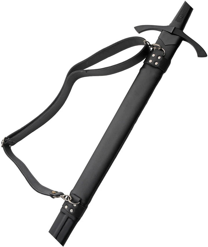 44.5″ (113.03cm) overall. 34″ (86.36cm) black finish 1065 carbon steel blade. Black textured synthetic handle. Steel guard and pommel. Leather wrapped scabbard with shoulder strap. Black wood scabbard. Boxed.