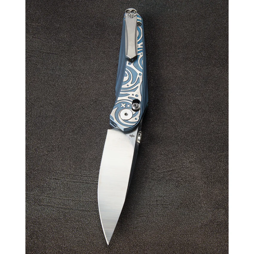 4.5″ (11.43cm) closed. 3.5″ (8.89cm) satin finish Bohler M390 stainless blade. Blue and silver titanium handle. Thumb disk. Pocket clip. Black nylon zippered storage case. Boxed.