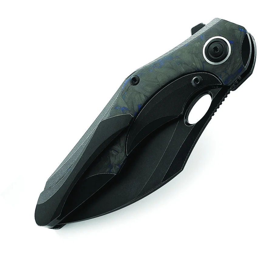 4.63″ (11.76cm) closed. 3.38″ (8.59cm) black stonewash finish Bohler M390 stainless blade. Black stonewash finish titanium handle withbBlack and blue marble carbon fiber inlay. Extended tang. Pocket clip. Thumb pull. Design by Kombou. Black nylon zippered storage case. Boxed.