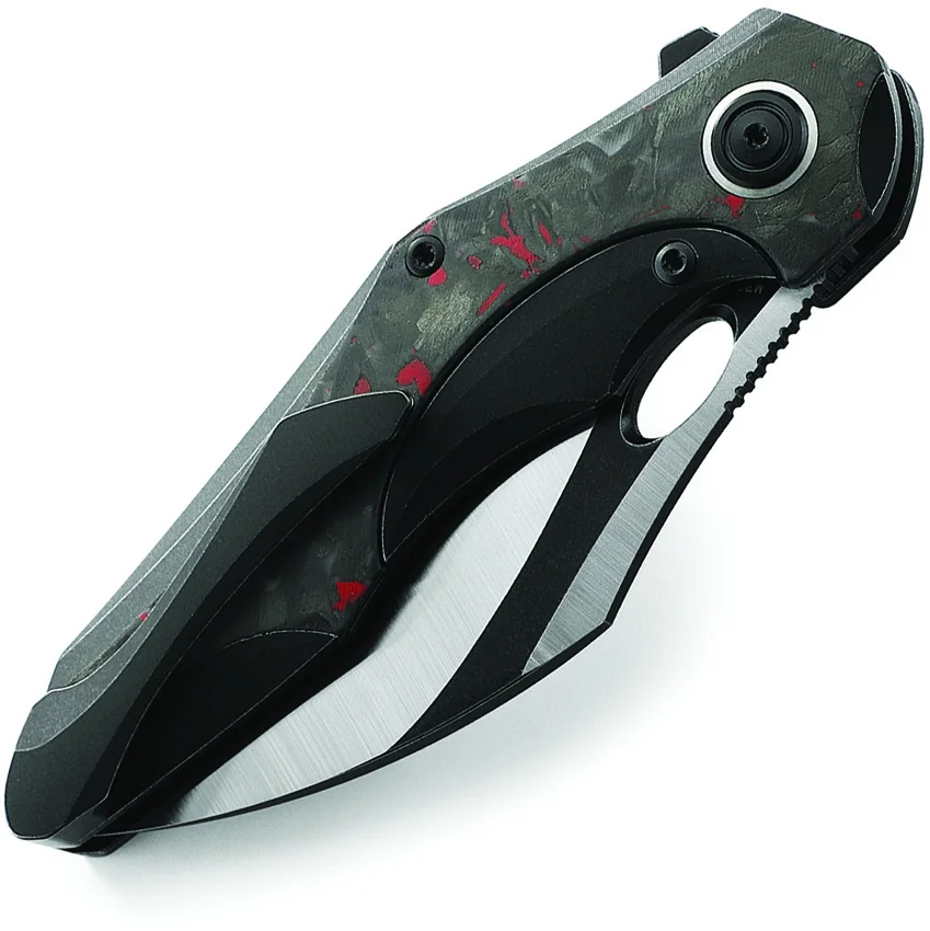 4.63″ (11.76cm) closed. 3.38″ (8.59cm) black stonewash and satin finish Bohler M390 stainless blade. Black titanium handle with black and red marble carbon fiber inlay. Extended tang. Pocket clip. Thumb pull. Design by Kombou. Black nylon zippered storage case. Boxed.