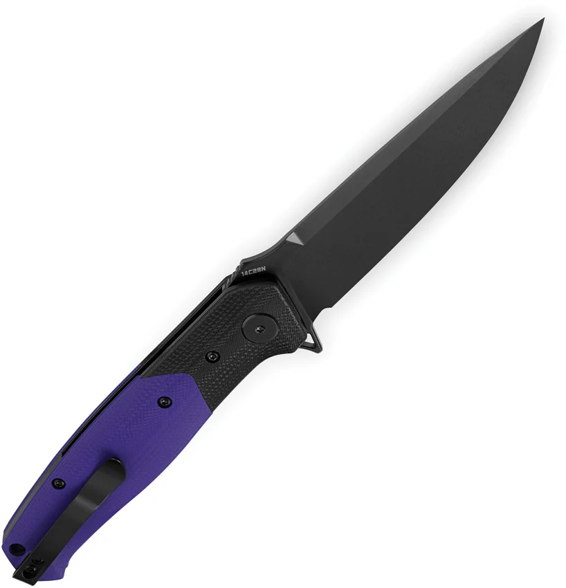5.13″ (13.03cm) closed. 4″ (10.16cm) black PVD coated 14C28N Sandvik stainless blade. Black and purple G10 handle. Extended tang. Lanyard hole. Pocket clip. Boxed.