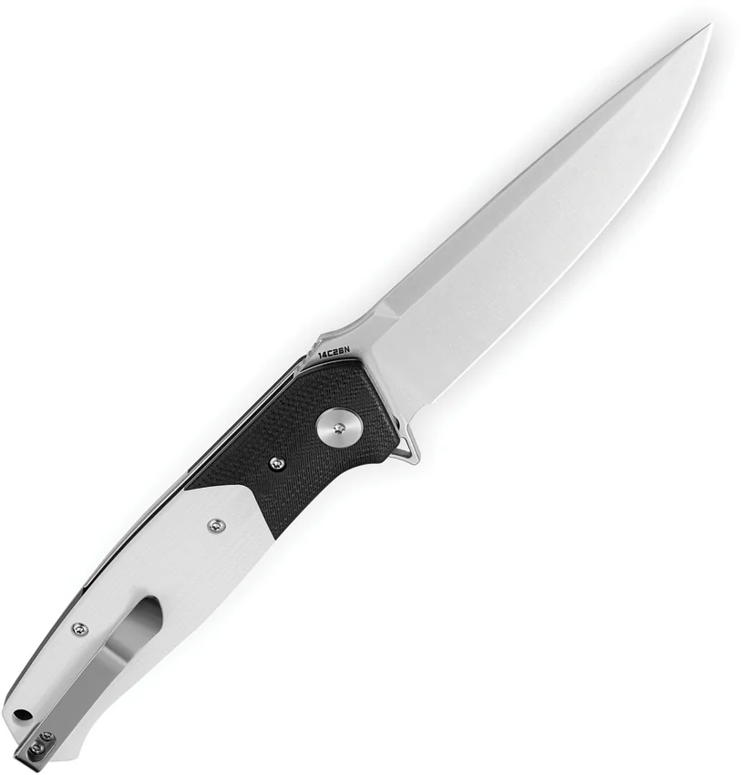 5.13″ (13.03cm) closed. 4″ (10.16cm) satin finish 14C28N Sandvik stainless blade. Black and white G10 handle. Extended tang. Lanyard hole. Pocket clip. Boxed.