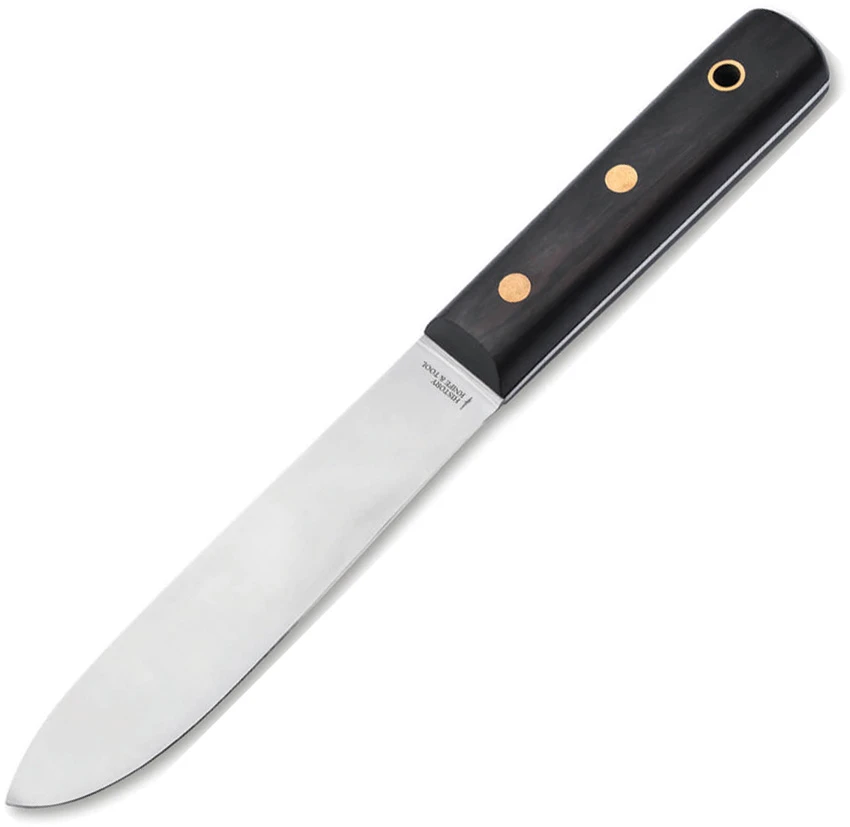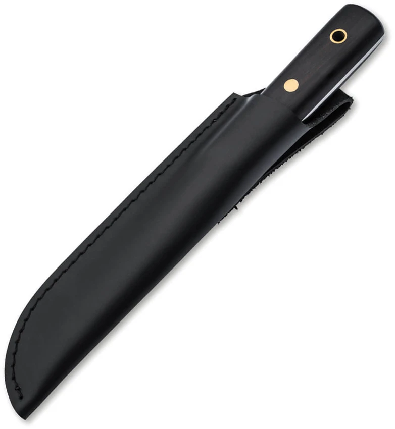 9.5″ (24.13cm) overall. 5.25″ (13.36cm) satin finish stainless blade. Ebony wood handle. Full tang. Lanyard hole. Brown leather belt sheath. Boxed.
