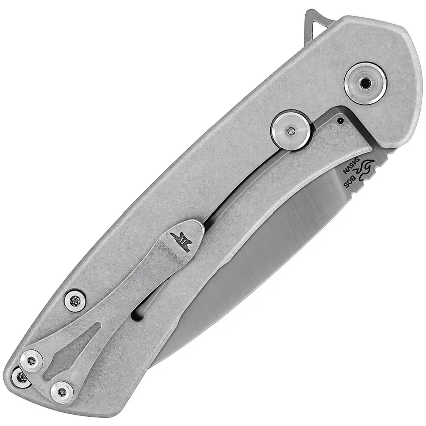 4.38″ (11.13cm) closed. 3.38″ (8.59cm) satin finish blade. Black G10 handle with stainless back handle. Extended tang. Pocket clip. Lanyard hole. Paul Bos heat treated CPM S45VN stainless drop point blade. Boxed.