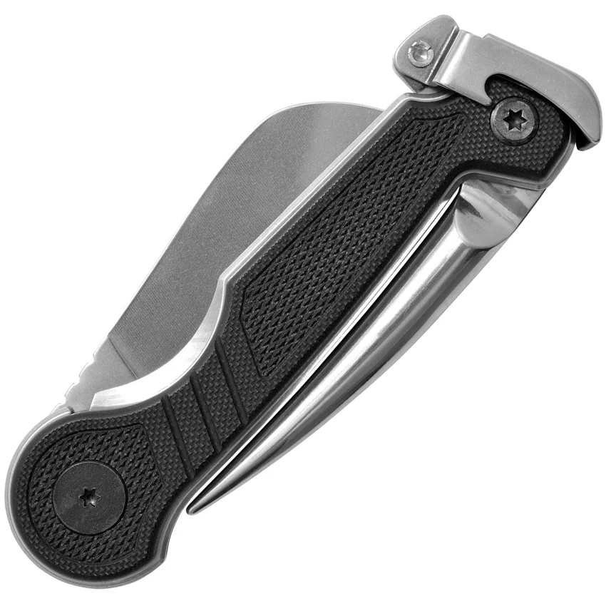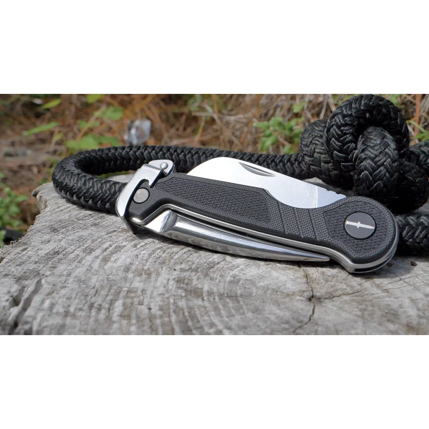 5″ (12.7cm) closed. 2.5″ (6.35cm) 440 stainless sheepsfoot blade. Black G10 handle. Bottle opener. Marlin spike. Titanium bonded blade. Clam packed.