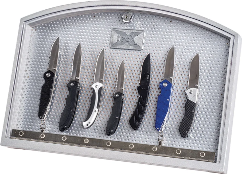 Dimensions: 19.5″ x 13.69″ x 2″. Metal display with magnetic interior. Comes with a pilfer-proof lock and allows the opportunity to display knives standing up, laying flat, or hanging from the wall. Knives pictured not included. Boxed.