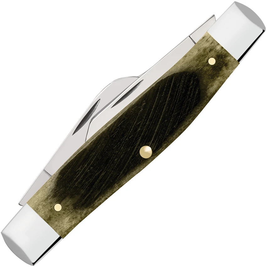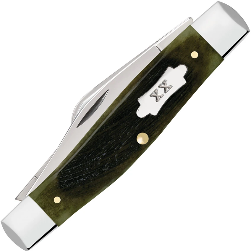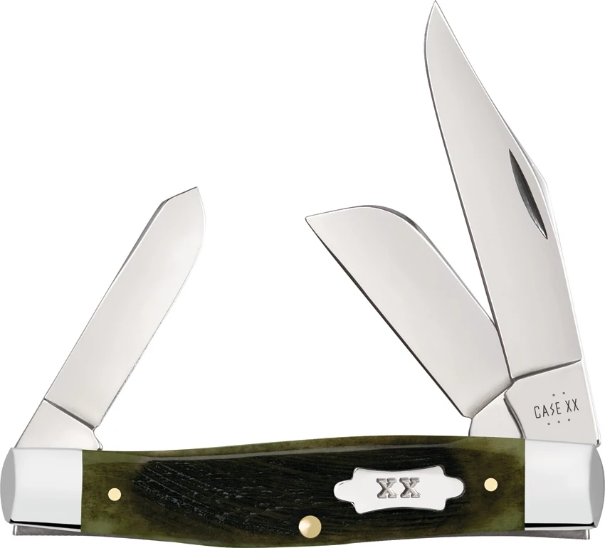6375 SS pattern. 4.25″ (10.8cm) closed. Mirror finish stainless clip, spey, and sheepsfoot blades. Olive green sawcut bone handle. Nickel silver bolster(s). Inlay shield. Boxed.