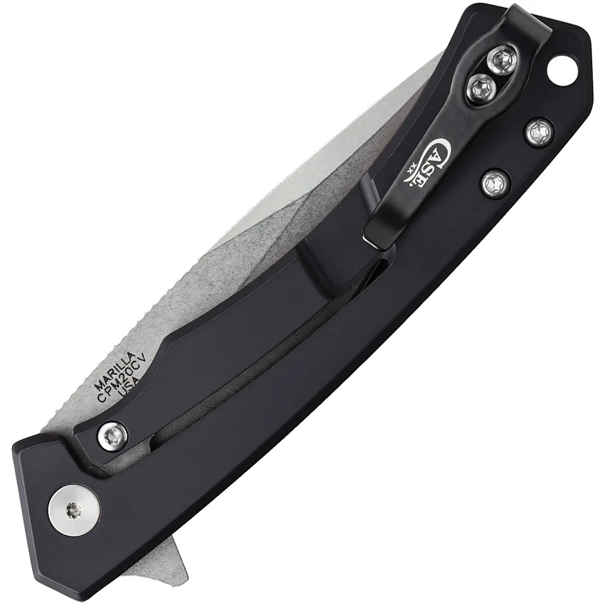 MARILLA CPM 20-CS pattern. 4.75″ (12.07cm) closed. 3.75″ (9.53cm) stonewash finish S35VN stainless blade. Black anodized aluminum handle with black G10 inlay. Pocket clip. CPM-20CS stainless drop point blade. Boxed.
