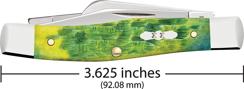 63032 SS pattern. 3.63″ (9.22cm) closed. Mirror finish stainless clip, sheepsfoot, and pen blades. Green apple peach seed jigged bone handle. Nickel silver bolster(s). Inlay shield. Boxed.
