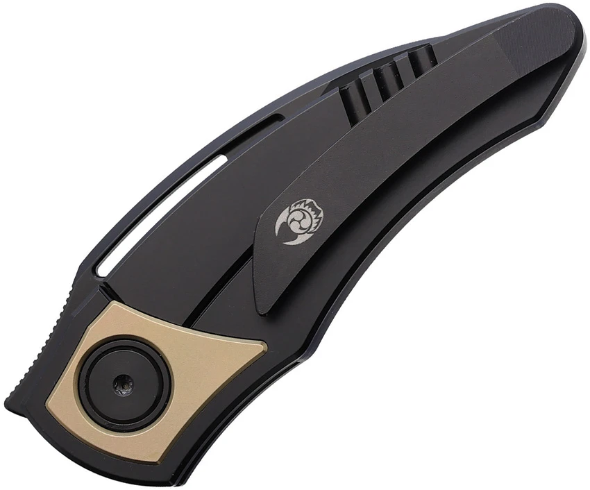 3.5″ (8.89cm) closed. 2.13″ (5.41cm) black PVD coated Bohler M390 stainless blade. Black and gold titanium handle. Thumb pull. Pocket clip. Boxed.
