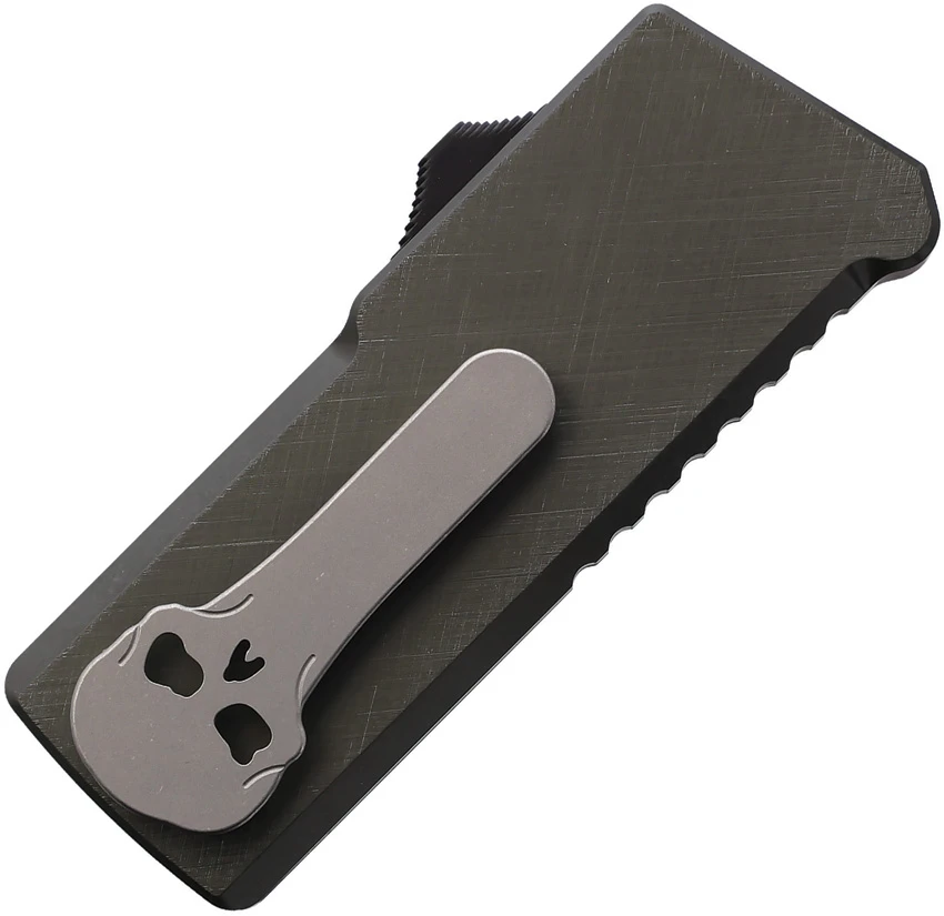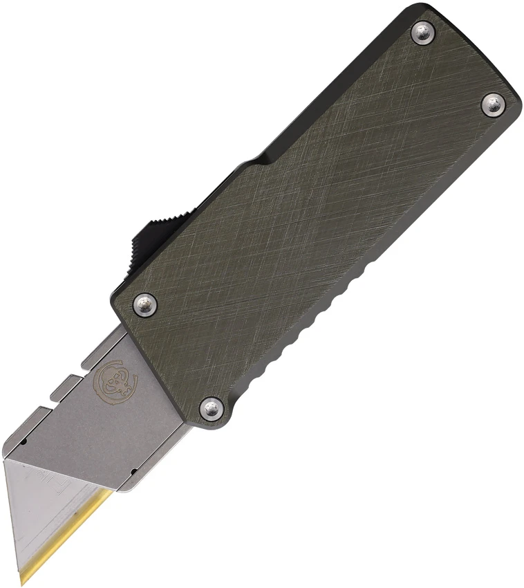 Automatic opening. 3.38″ (8.59cm) closed. Green aluminum handle. Pocket clip. Replaceable utility blade. Crosshatch pattern handle.