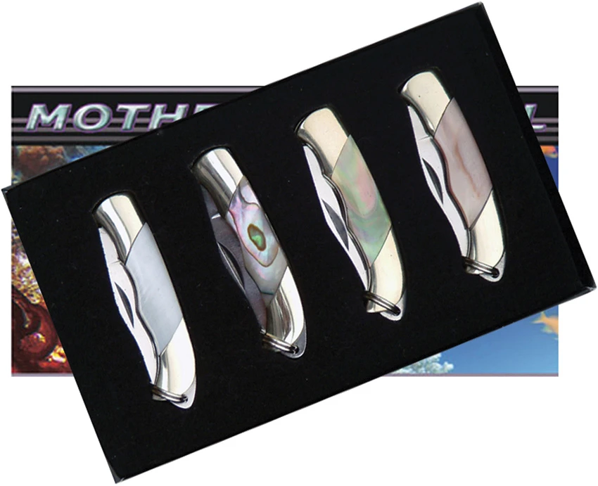1.5″ (3.81cm) closed. 0.75″ (1.91cm) mirror finish stainless clip point blade. Mother of pearl handle. Nickel silver bolster(s). Keyring. Set of four. Boxed.