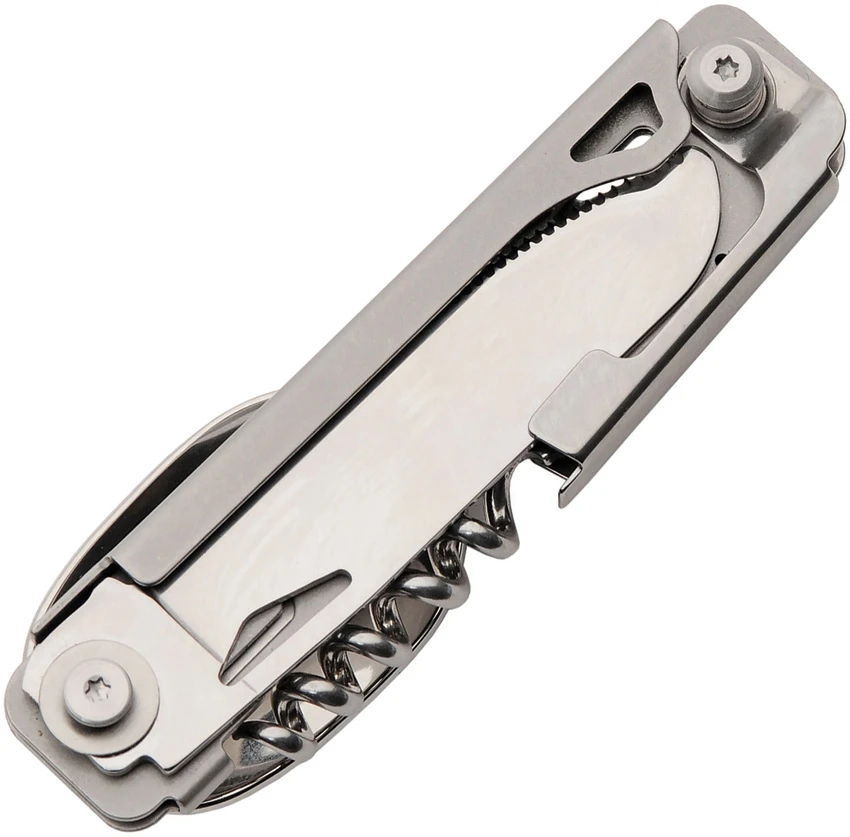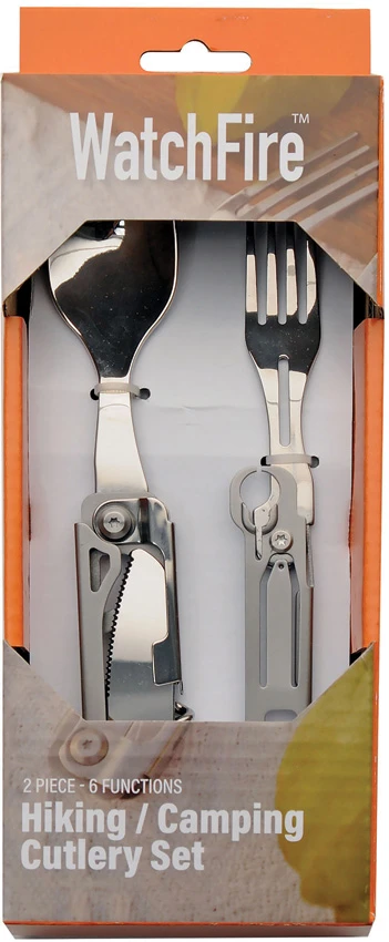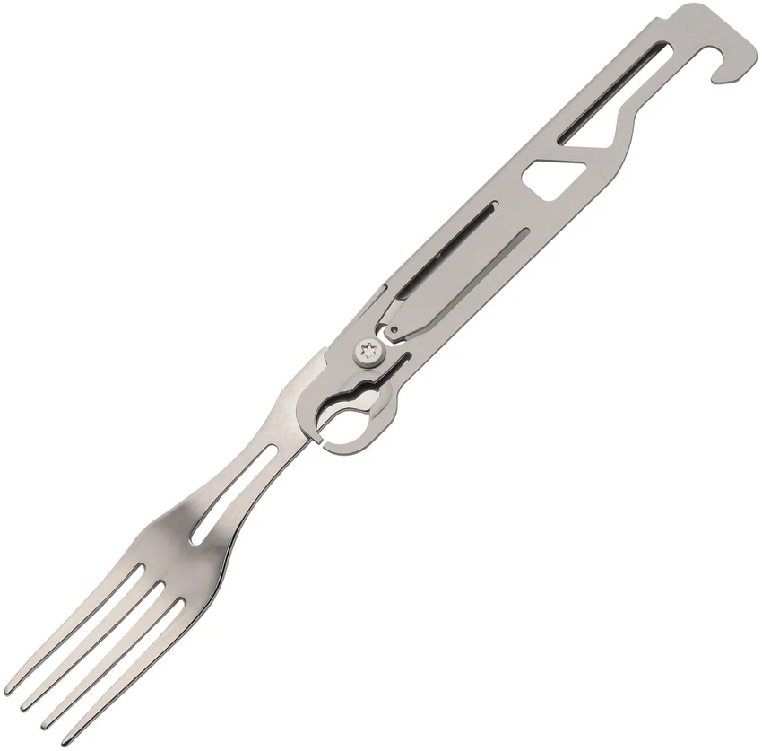 7.25″ (18.42cm) overall. 4″ (10.16cm) closed. Tools include: Serrated blade l Corkscrew l Bottle opener l Can opener. Spoon I Fork. 420 stainless construction. Fork separates from spoon and knife. Black nylon sheath. Boxed with hanging tab.