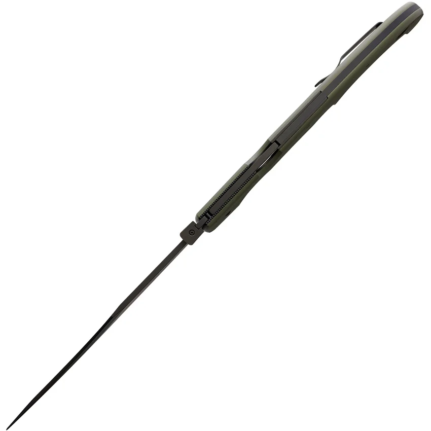 9.25″ (23.5cm) closed. 7.5″ (19.05cm) black finish AUS-10A stainless blade. OD green G10 handle. Thumb disk. Pocket clip.