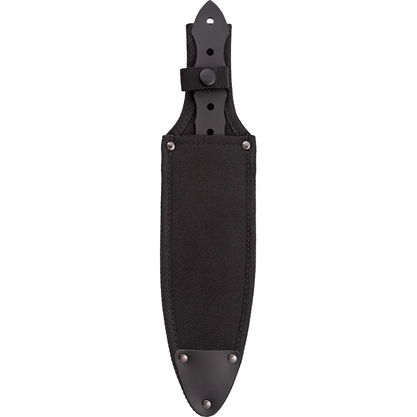 Overall: 14″; Blade: 8.25″ l S50C Stainless l Standard Edge l Black Finish; Handle: Black l Stainless; Other Info: Full Tang l Lanyard Hole. One-piece tempered Roman point blade. Handle has machined hole cut outs and finger grooves and can be paracord wrapped. Black nylon sheath. Hang Packaged.