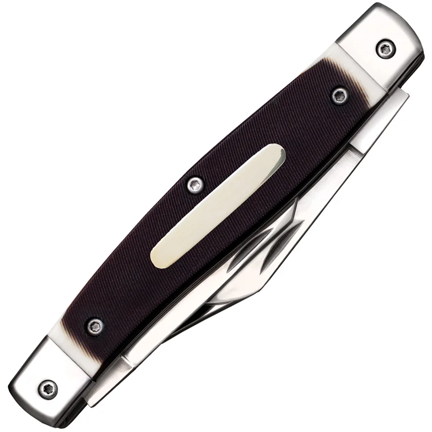 4.25″ (10.8cm) closed. Satin finish 8Cr13MoV stainless clip, sheepsfoot, and spey blades. Brown sawcut bone handle. Stainless bolster(s). Inlay shield. Brown leather belt sheath. Boxed.