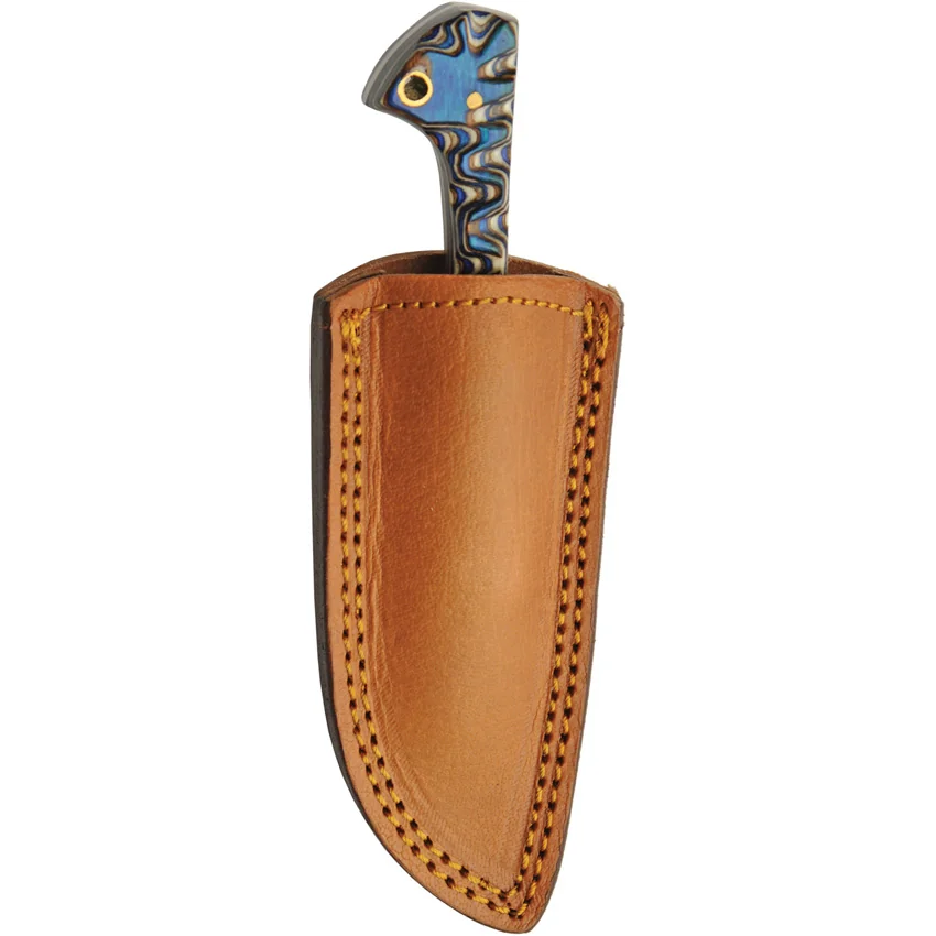 6.63″ (16.84cm) overall. 2.63″ (6.68cm) Damascus steel caping blade. Blue sculpted pakkawood handle. Full tang. Lanyard hole. Brown leather belt sheath. Boxed.