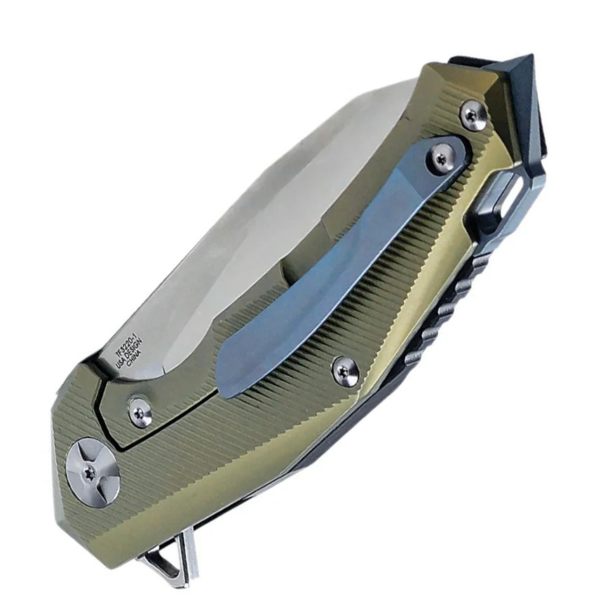 5.13″ closed. 3.63″ D2 tool steel sheepsfoot blade. Black G10 handle with green titanium back handle. Extended tang. Lanyard hole. Pocket clip. Glass breaker. Stonewash and satin finish blade. Boxed.