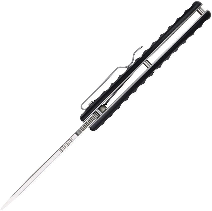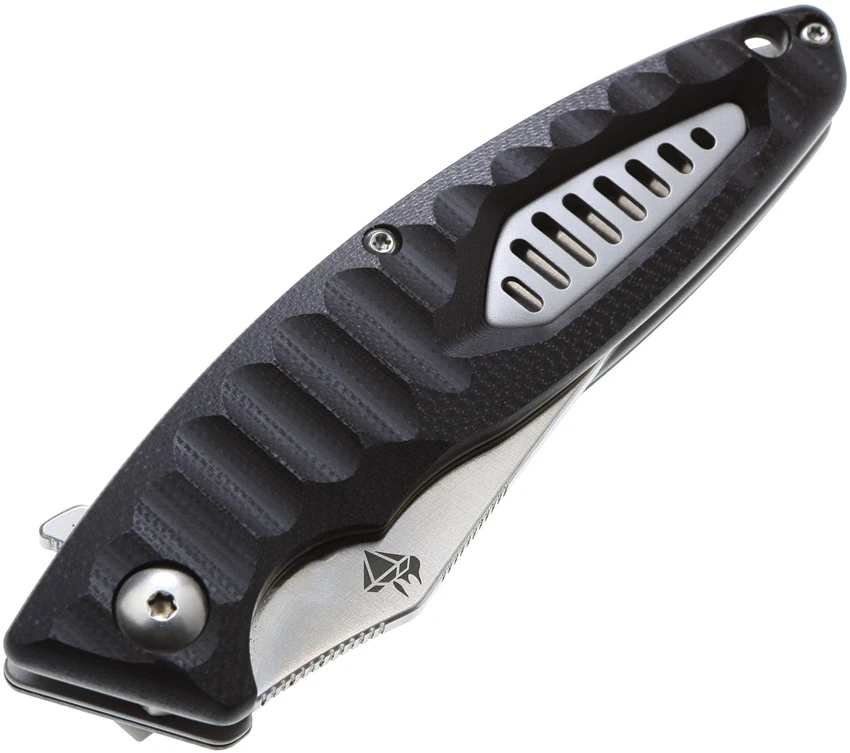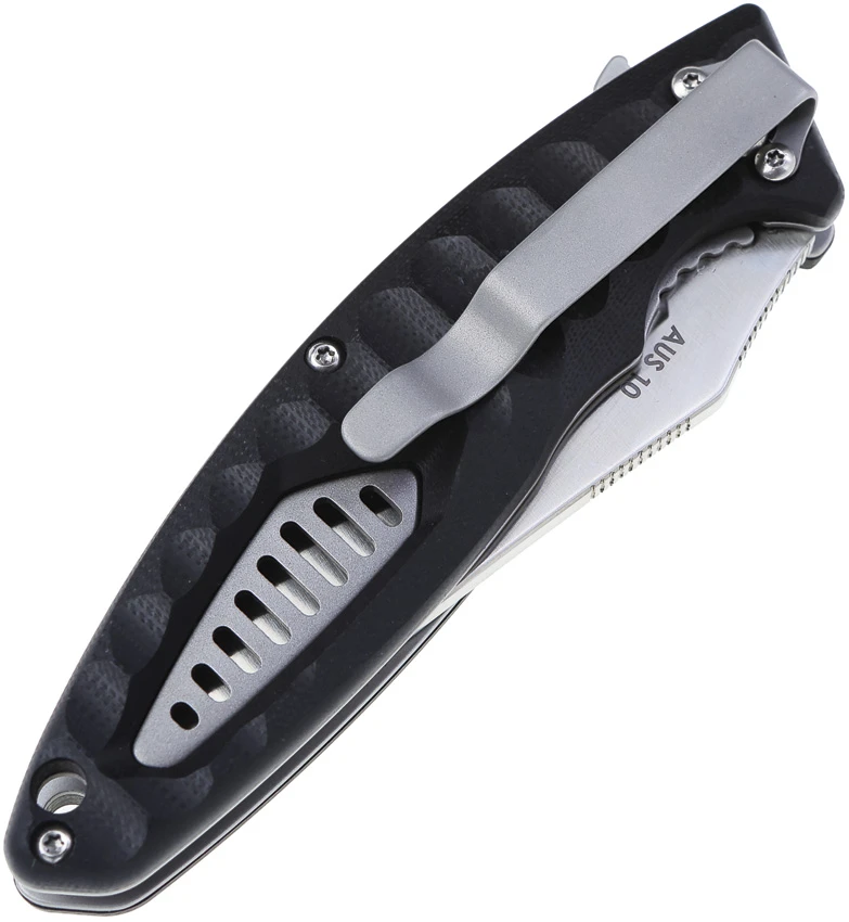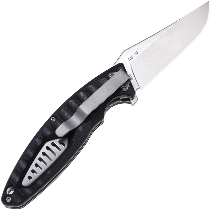 4.5″ (11.43cm) closed. 3.25″ (8.26cm) satin finish AUS-10A stainless clip point blade. Black G10 handle. Extended tang. Lanyard hole. Pocket clip. Boxed.