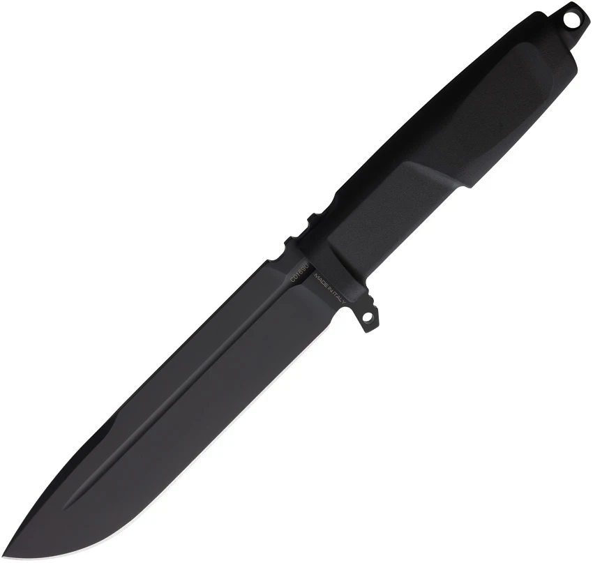 11.13″ (28.27cm) overall. 6″ (15.24cm) black MIL-C-13924 burnished Bohler N690 stainless blade. Black Forprene handle. Full, extended tang. Lanyard hole. Sheath has a 2nd level retention system. Black nylon MOLLE compatible belt sheath. Boxed.