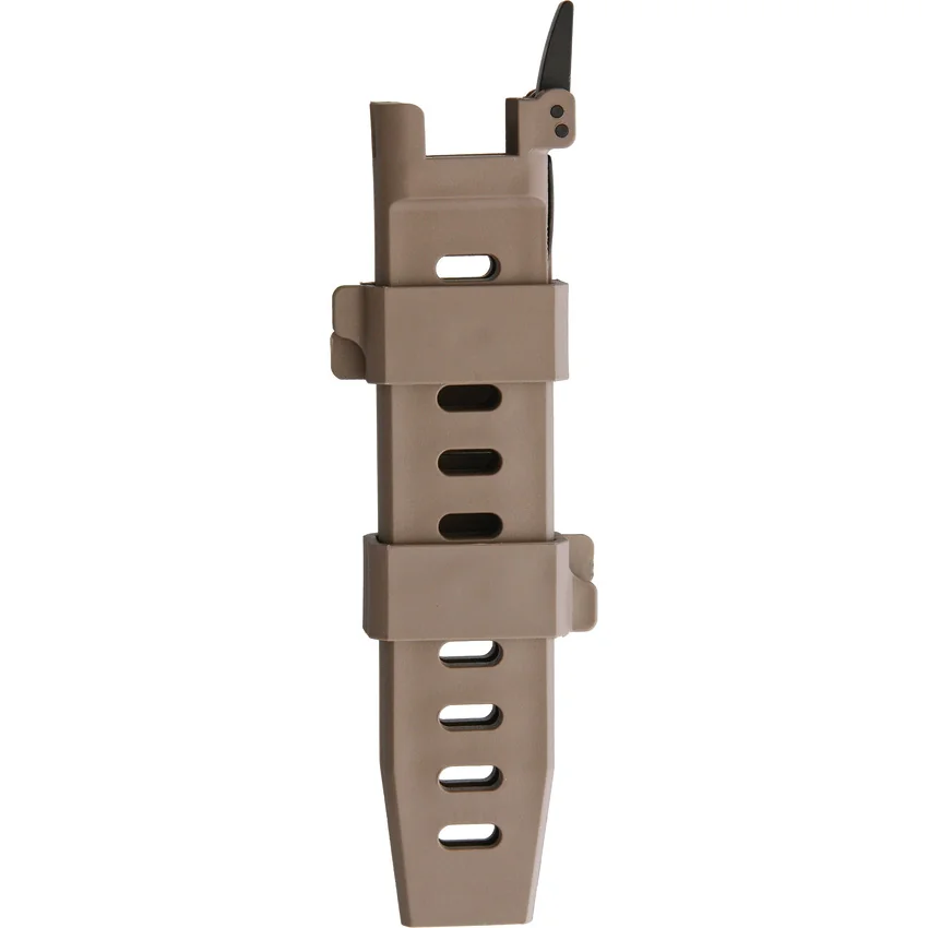 Mamba. 9.25″ overall. 4.5″ Bohler N690 stainless tanto blade. Desert tan Forprene handle. Full tang. Glass breaker. Tan Kydex belt sheath. Boxed.