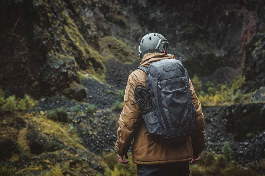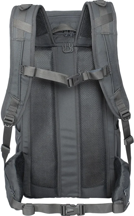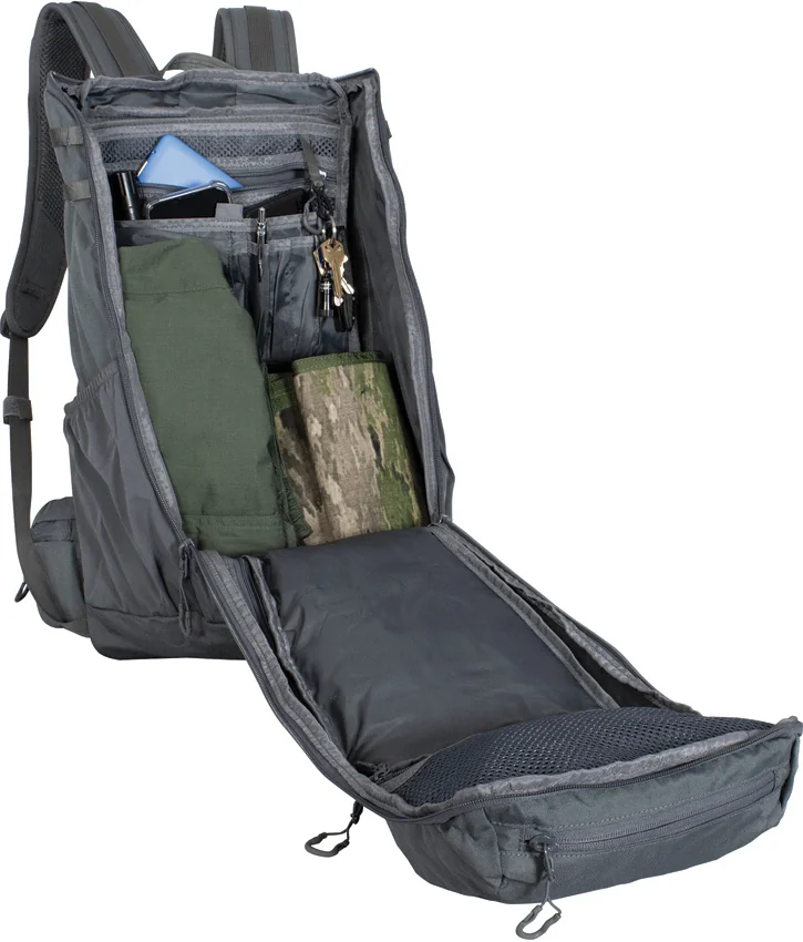 Dimensions: 18.5″ x 11.5″ x 5.75″. 30 liter capacity. Large main compartment. Top zipped stash pocket. Front zipped large pocket. Front zip quick access to main compartment. Low profile front pocket. (2) elastic side pockets. Detachable inner organizer. Inner lid zipped mesh pocket. Adjustable padded shoulder and chest straps. Adjustable padded hip belt with zipped pockets. Airmesh padded back system. Hook and loop ID patch. Hydration pocket with pass through port. Color: Tornado gray. 600D XTP construction. Bulk packed.