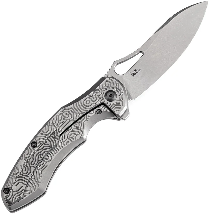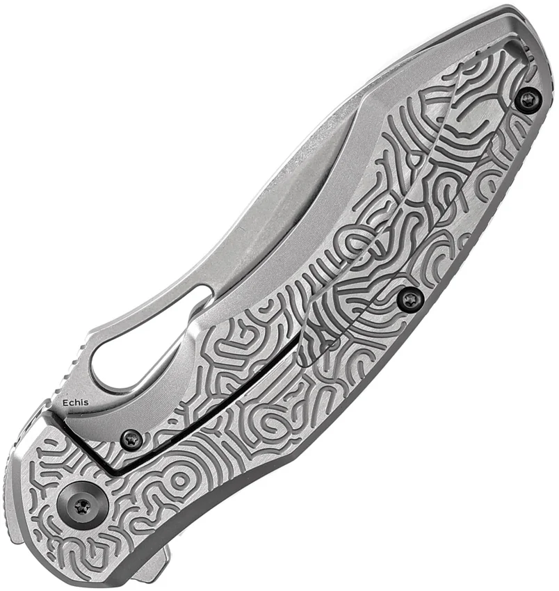 4.5″ (11.43cm) closed. 3.5″ (8.89cm) stonewash finish CPM S35VN stainless drop point blade. Gray textured titanium handle. Extended tang. Thumb pull. Pocket clip. Black nylon pouch. Boxed.