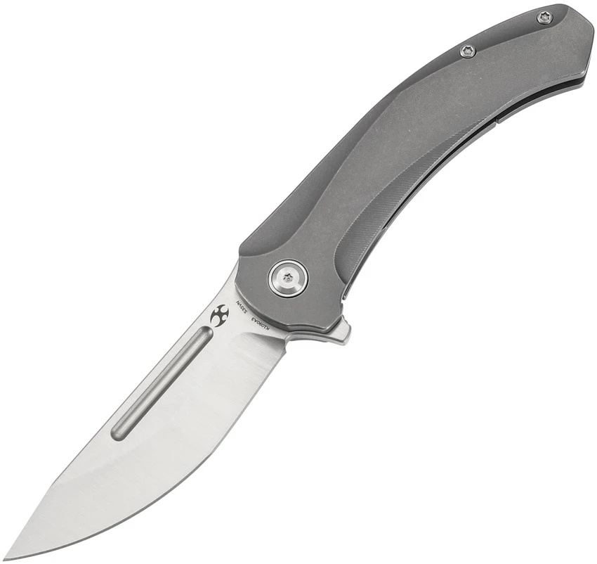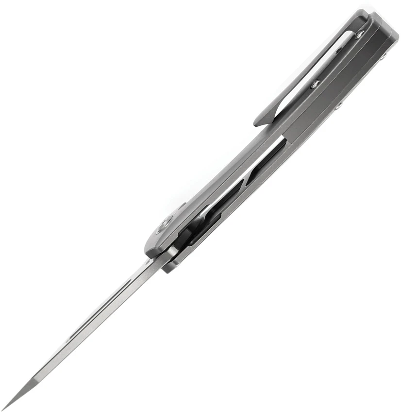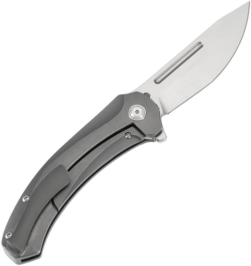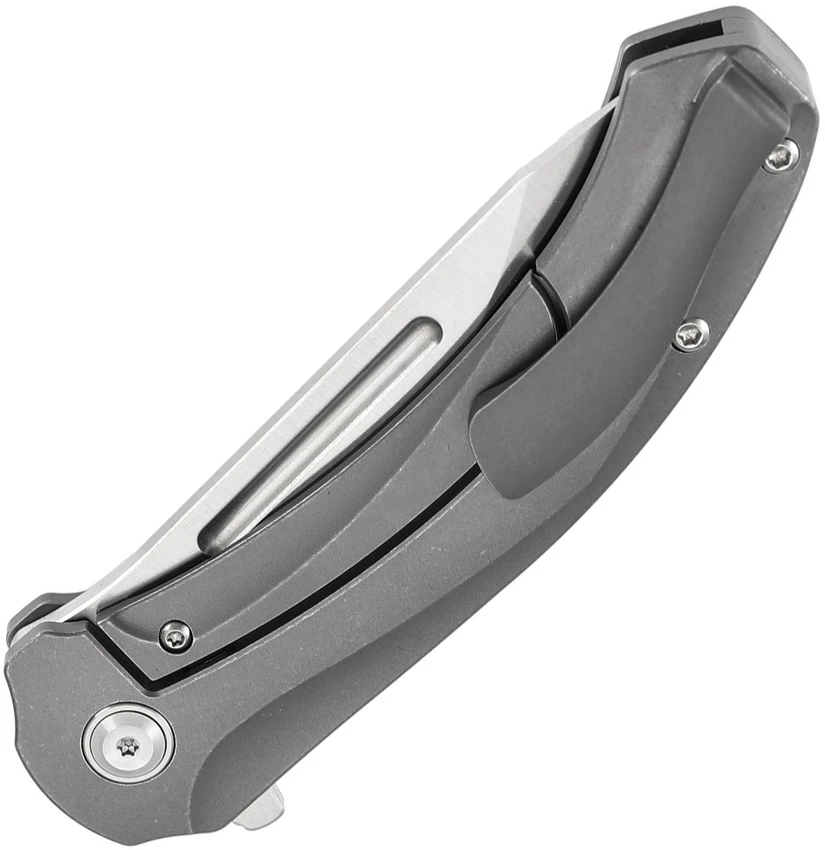 4.5″ (11.43cm) closed. 3.5″ (8.89cm) satin finish CPM S35VN stainless tanto blade. Titanium handle. Extended tang. Pocket clip. Gray anodized and stonewash handle. Boxed.