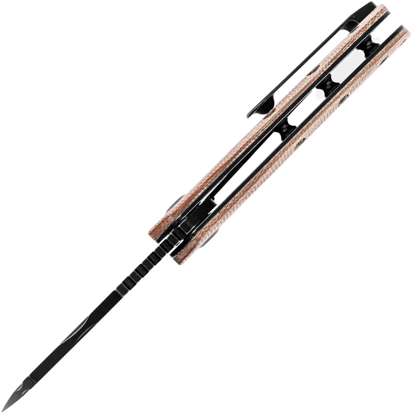 4″ (10.16cm) closed. 3″ (7.62cm) black stonewash finish 154CM stainless blade. Brown canvas micarta handle. Extended tang. Lanyard hole. Pocket clip. Black nylon pouch. Boxed.