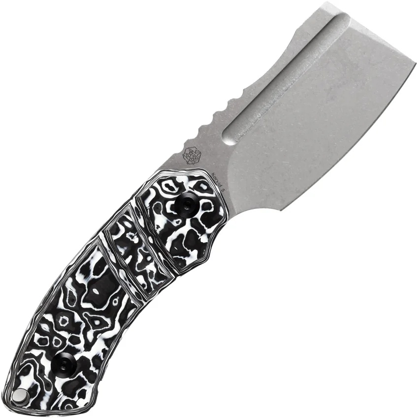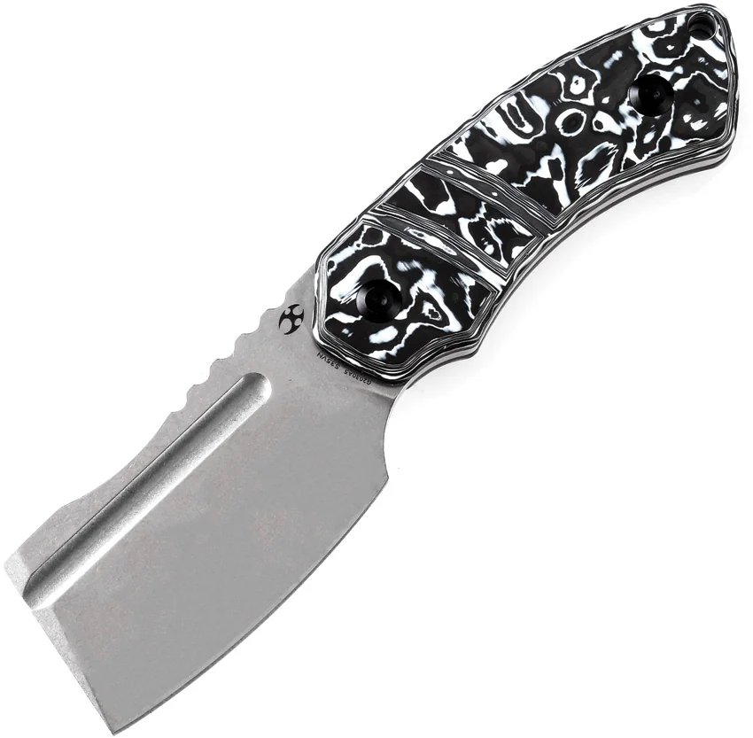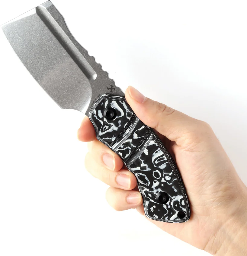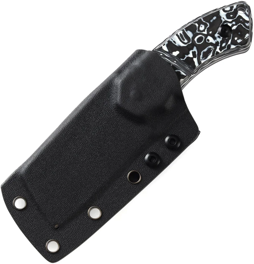6.75″ (17.15cm) overall. 3″ (7.62cm) stonewash finish 14C28N Sandvik stainless blade. Black and white carbon fiber handle. Full tang. Lanyard hole. Black Kydex belt sheath. Boxed.