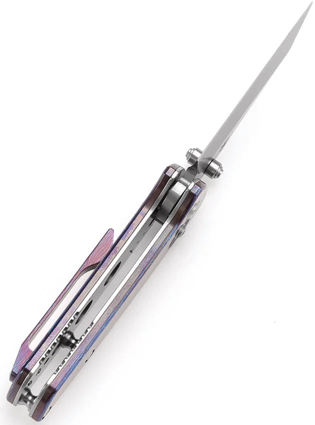 3.13″ (7.95cm) closed. 2.25″ (5.72cm) Damascus steel blade. Timascus handle. Thumb stud. Pocket clip. Black nylon pouch. Boxed.