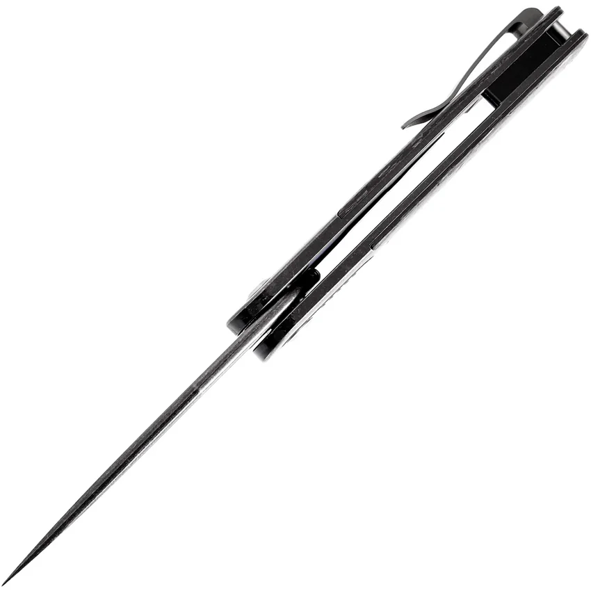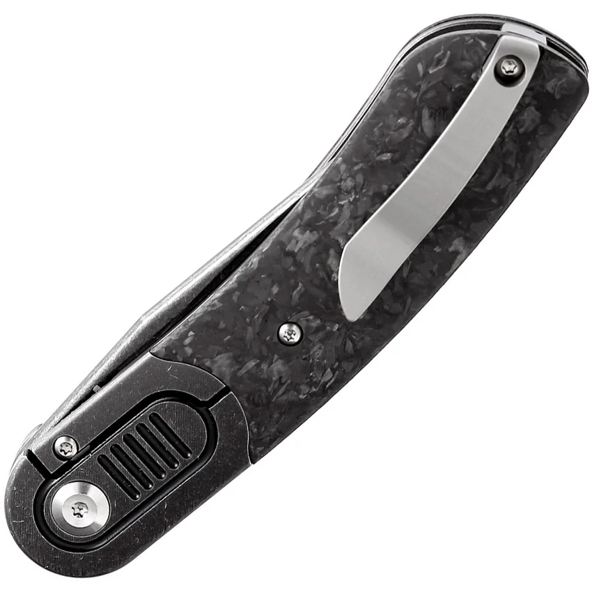 4.13″ (10.49cm) closed. 3.13″ (7.95cm) black stonewash finish S35VN stainless blade. Carbon fiber handle. Titanium bolster(s). Pocket clip. Black nylon pouch. Boxed.