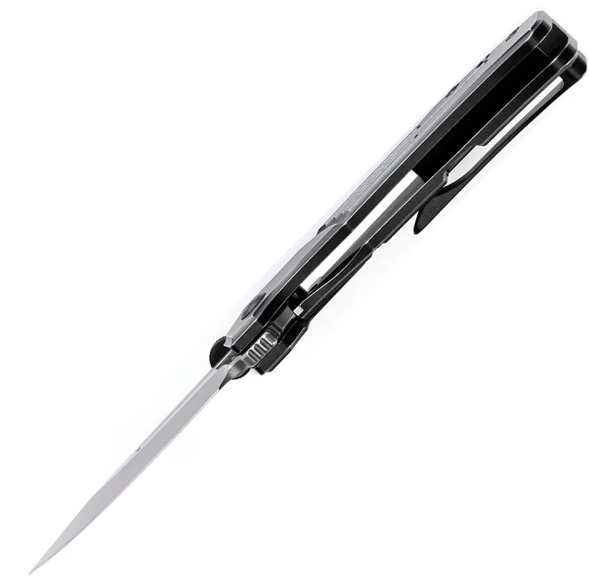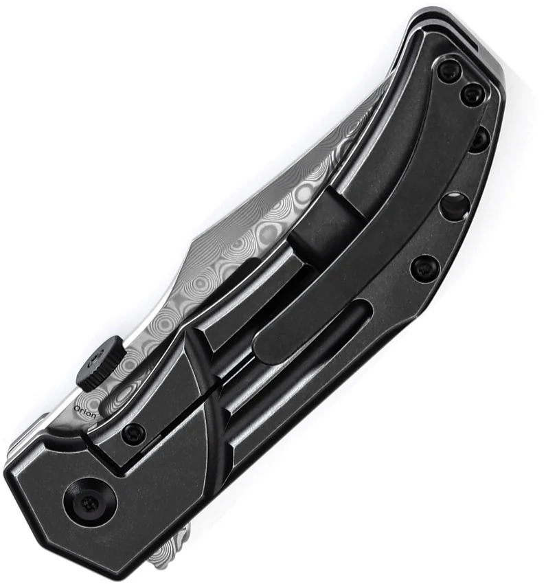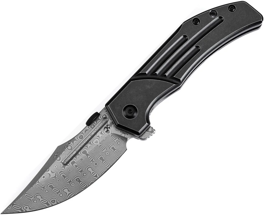 4.13″ (10.49cm) closed. 3.13″ (7.95cm) Damascus steel clip point blade. BlackWash titanium handle. Thumb disk. Extended tang. Lanyard hole. Pocket clip. CNC textured blade. Black nylon pouch. Boxed.
