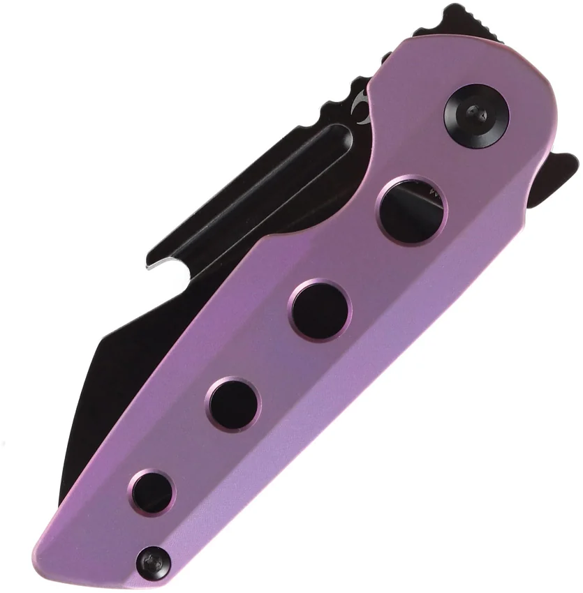 3.5″ (8.89cm) closed. 2.63″ (6.68cm) black stonewash finish S35VN stainless Wharncliffe blade. Purple anodized titanium handle. Extended tang. Pocket clip. Notched blade. Black nylon pouch. Boxed.