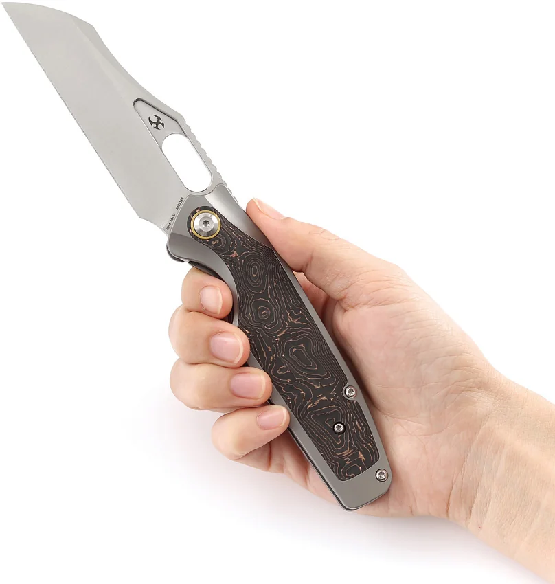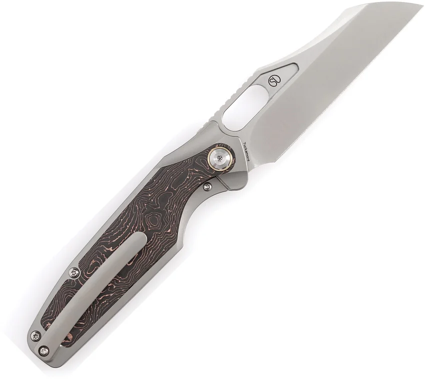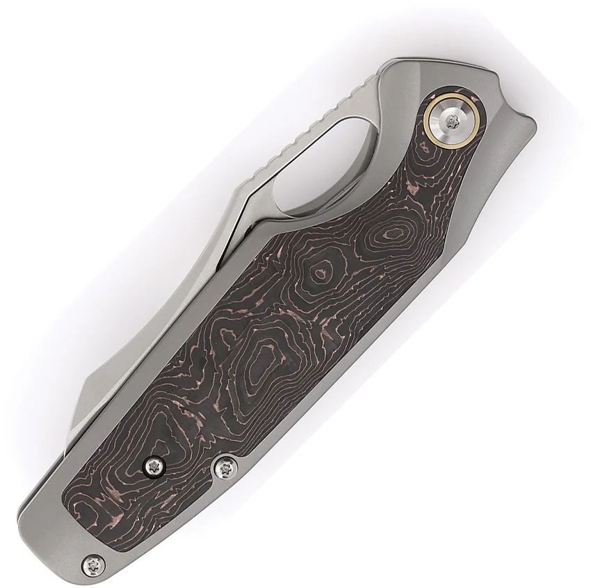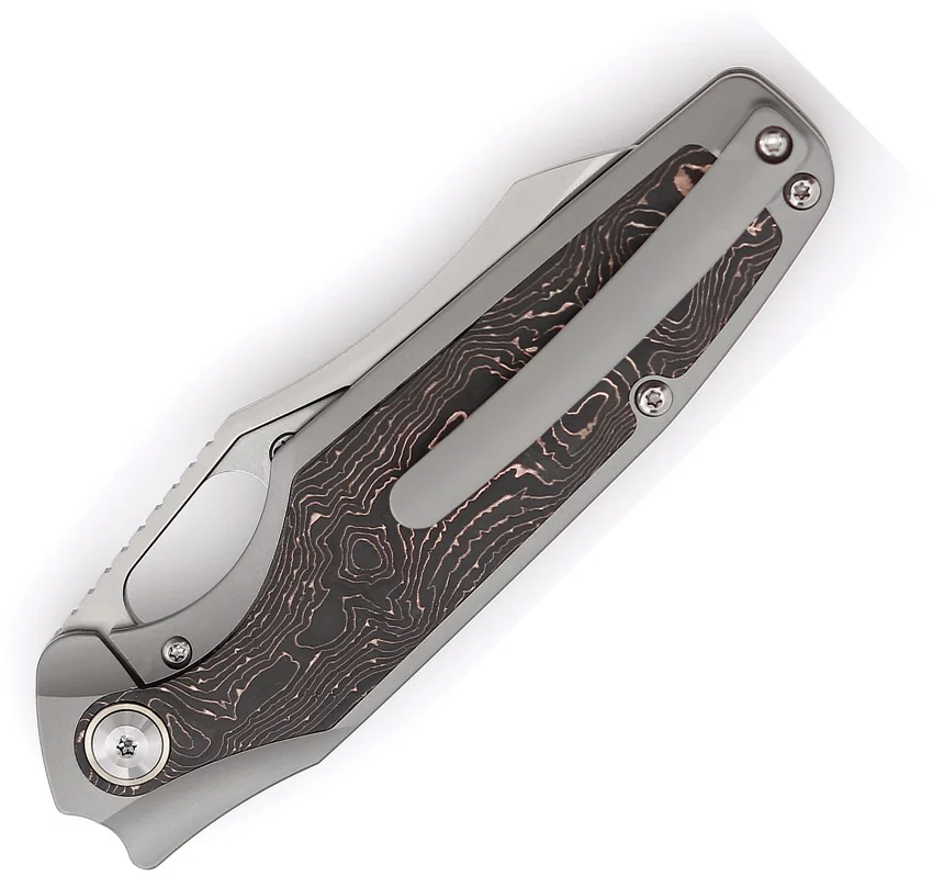4.5″ (11.43cm) closed. 3.5″ (8.89cm) satin finish CPM-20CV stainless Wharncliffe blade. Gray titanium handle with Copper foil carbon fiber inlay. Thumb pull. Pocket clip. Black nylon pouch. Boxed.