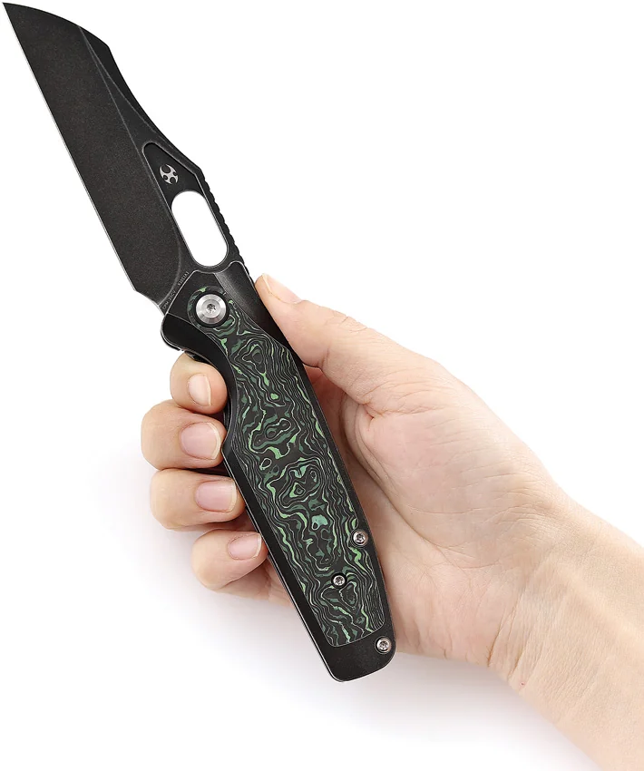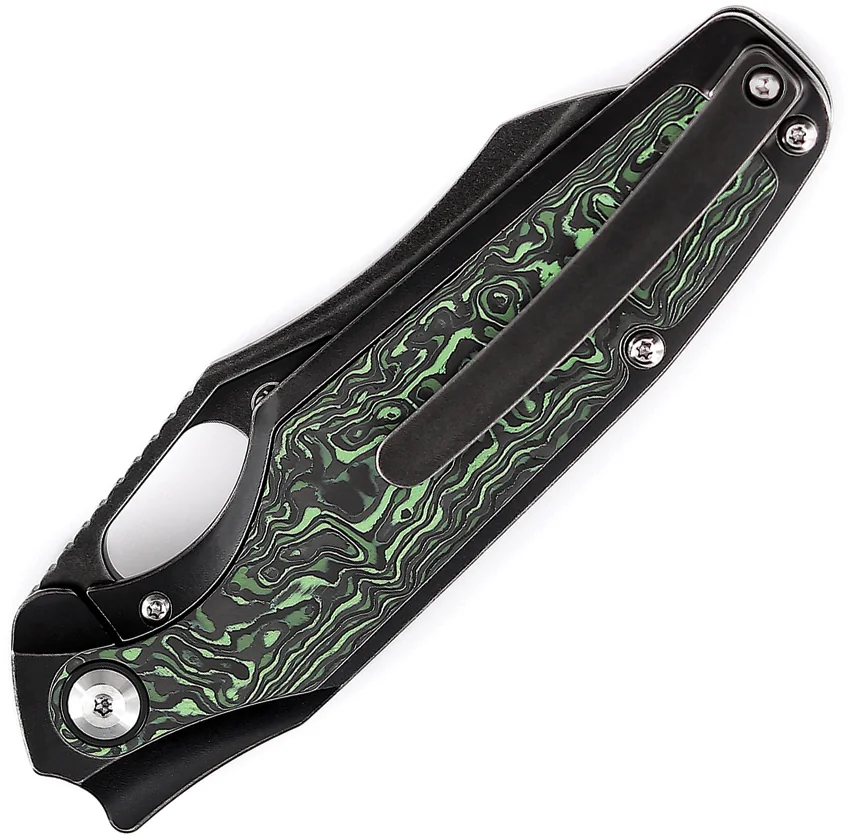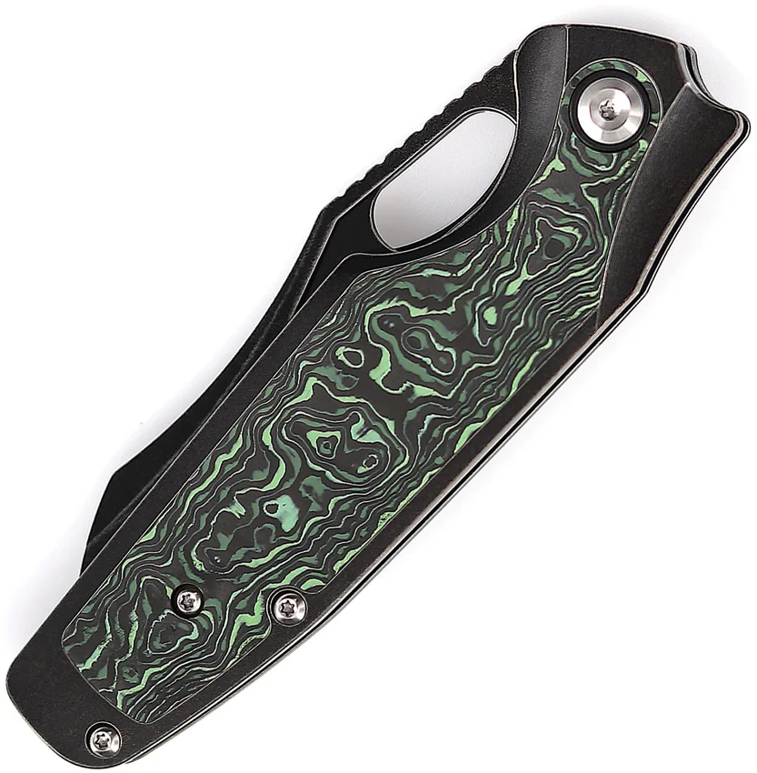 4.5″ (11.43cm) closed. 3.5″ (8.89cm) black stonewash finish CPM-20CV stainless blade. Black stonewash finish titanium handle with Green and black carbon fiber inlay. Thumb pull. Pocket clip. Black nylon pouch. Boxed.