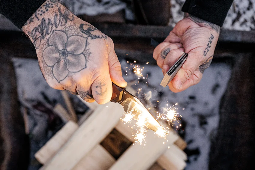 Automatic opening. 4.38″ (11.13cm) closed. 3.38″ (8.59cm) two-tone CPM-154 stainless blade. Black aluminum handle with brown G10 onlay. Lanyard hole. Pocket clip. Boxed.
