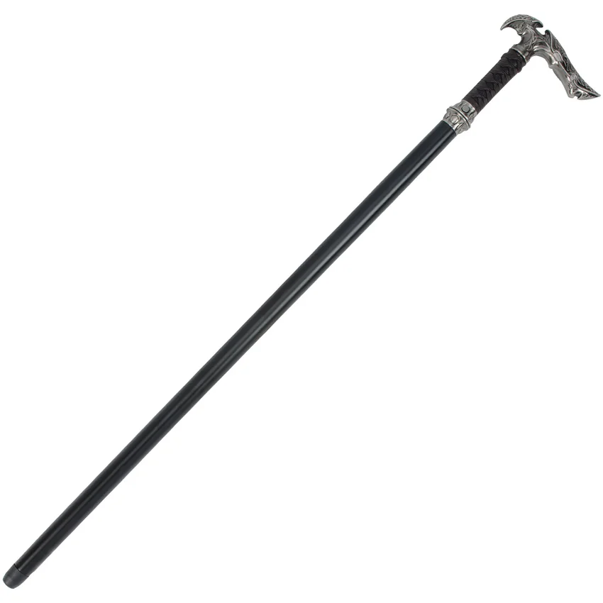 37.5″ (95.25cm) overall. 23″ (58.42cm) double edge 1045 carbon steel blade. Intricate scrollwork etchings on blade. Black rayskin and genuine brown leather wrapped handle with oversized cast heavy metal hilt and fittings. The shape and style of the handle offer a sure, confident and comfortable grip. The blade locks securely into the cane shaft and is accessed with a push of the hidden button that releases the blade locking mechanism on the handle. Black wooden scabbard with coordinating accents. No Amazon Sales
