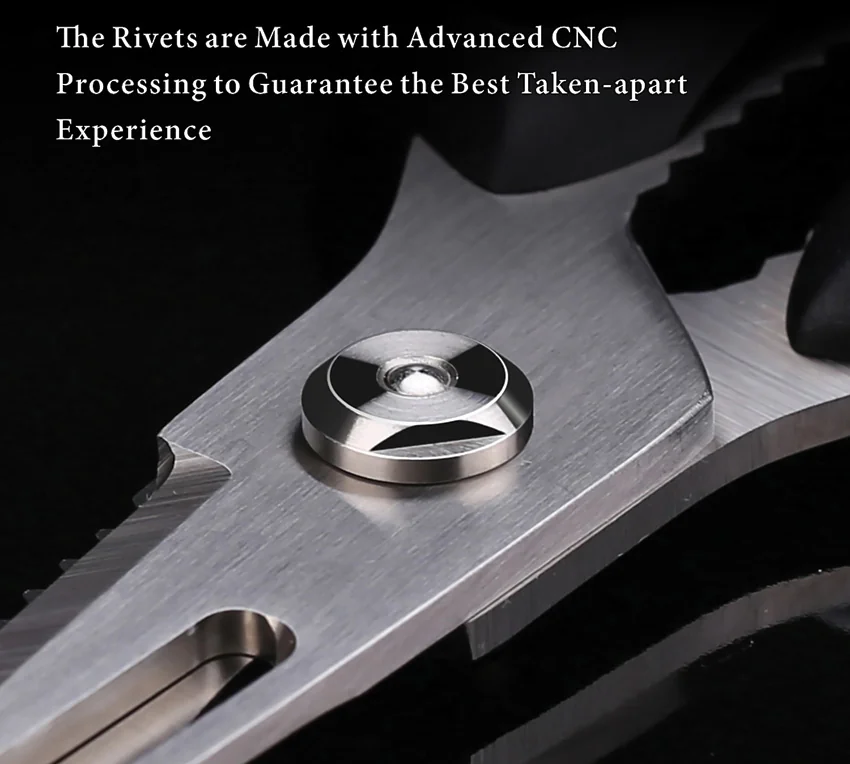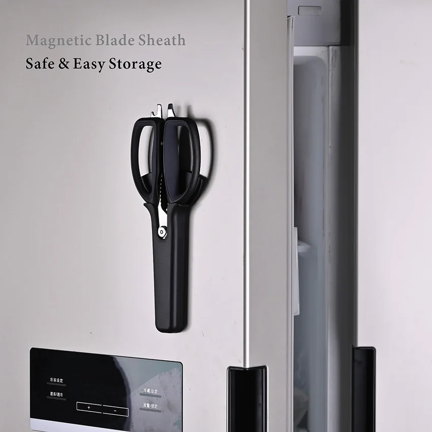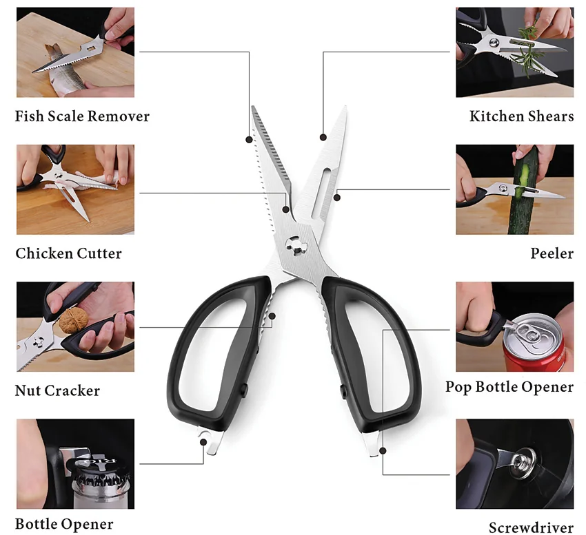 9.63″ overall. 5″ 5Cr15MoV stainless blades. Soft touch handle. Micro serration. Fish scale remover. Chicken cutter. Nut cracker. Bottle opener. Peeler. Screwdriver tip. Magnetic sheath. Detachable for easy cleaning. Boxed.