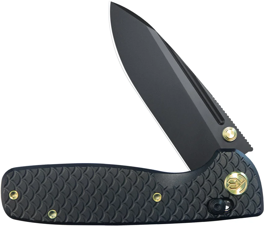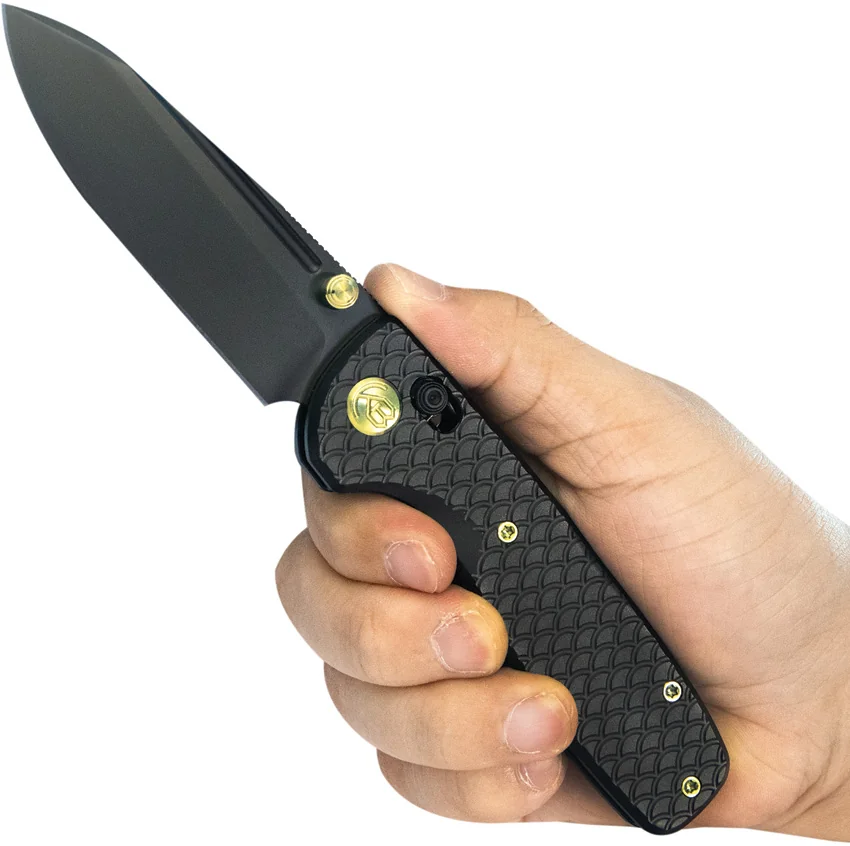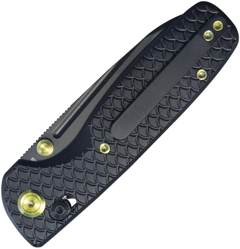 4″ (10.16cm) closed. 3″ (7.62cm) black satin finish S35VN stainless blade. Black titanium handle. Thumb stud. Lanyard hole. Pocket clip. Scale texture handle. Boxed.