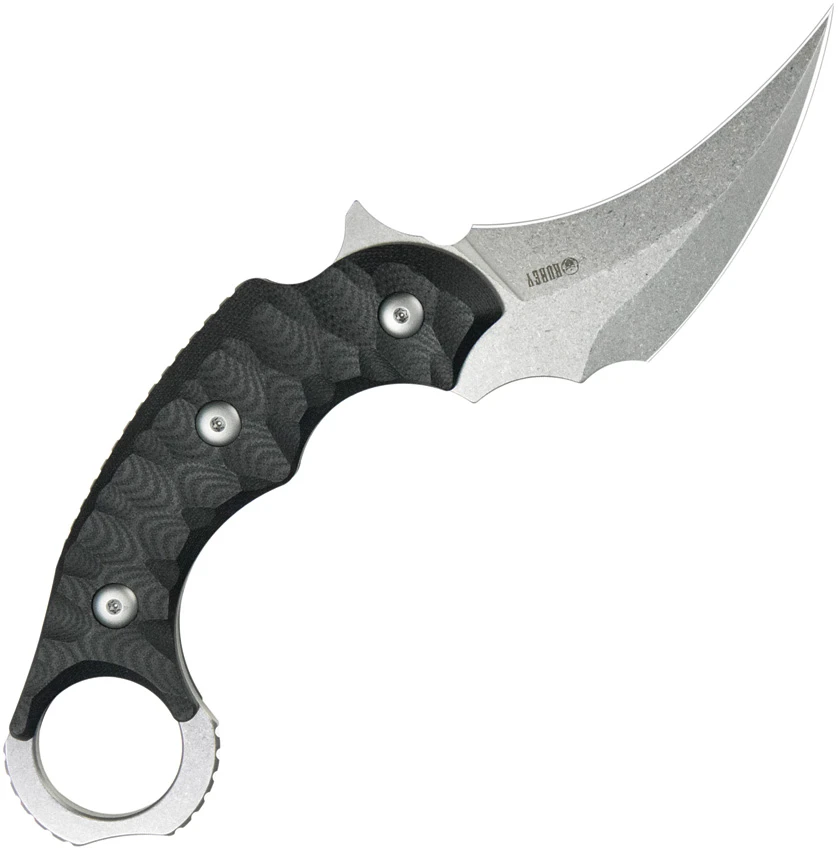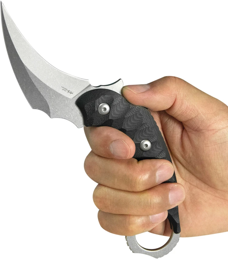 8″ (20.32cm) overall. 3″ (7.62cm) stonewash finish 14C28N Sandvik stainless karambit blade. Black G10 handle. Full, extended tang. Finger ring. Black Kydex belt sheath. Boxed.