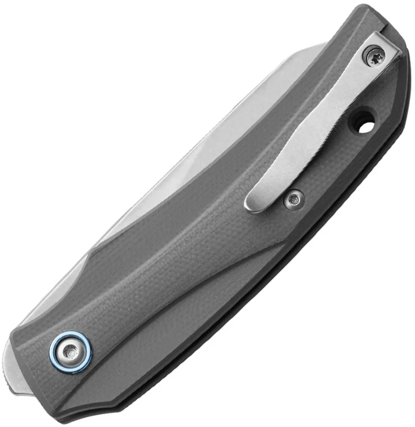 3.38″ (8.59cm) closed. 2.5″ (6.35cm) stonewash finish CPM MagnaCut stainless sheepsfoot blade. Gray G10 handle. Extended tang. Lanyard hole. Pocket clip. Black nylon zippered storage case. Boxed.