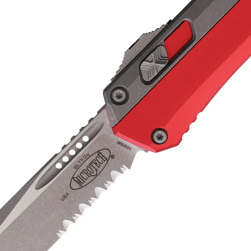 Automatic opening. 5.25″ (13.34cm) closed. 4″ (10.16cm) Apocalyptic finish partially serrated premium steel tanto blade. Pocket clip. Lanyard hole. Apocalyptic and red finish aluminum handle. Manual safety. Nickel boron internals. Boxed.