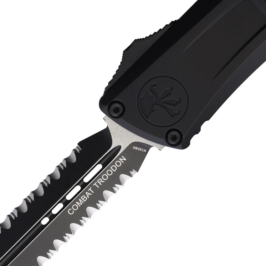 Automatic opening. 5.38″ (13.67cm) closed. 4″ (10.16cm) two-tone finish serrated Bohler M390MK stainless dagger blade. Black aluminum handle. Pocket clip. Lanyard hole. Glass breaker. Boxed.