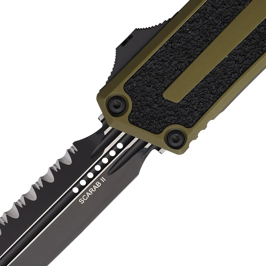 Automatic opening. 5.75″ (14.61cm) closed. 3.9″ (9.91cm) two-tone finish serrated premium steel dagger blade. OD green aluminum handle. Glass breaker. Lanyard hole. Pocket clip. Boxed.