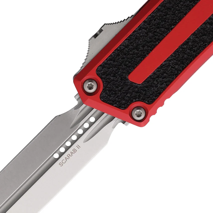 Automatic opening. 5.75″ (14.61cm) closed. 3.9″ (9.91cm) stonewash finish double edge Bohler M390MK stainless dagger blade. Red aluminum handle with black traction insert. Glass breaker. Lanyard hole. Pocket clip. Boxed.