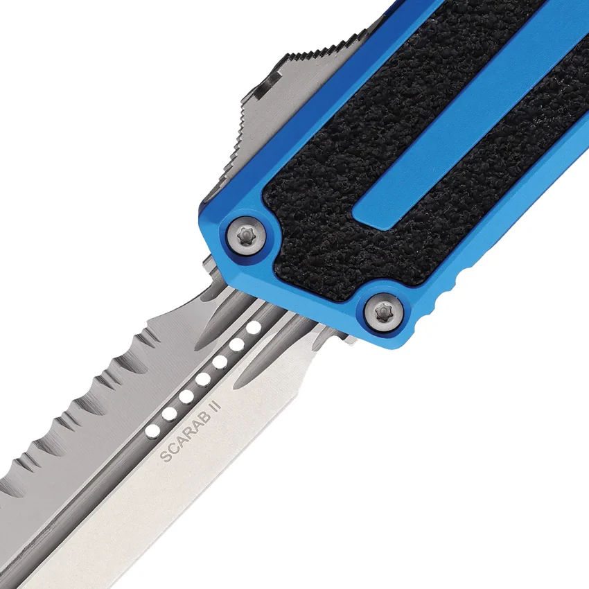 Automatic opening. 5.75″ (14.61cm) closed. 3.9″ (9.91cm) stonewash finish serrated Bohler M390MK stainless dagger blade. Blue aluminum handle with black traction insert. Glass breaker. Lanyard hole. Pocket clip. Boxed.