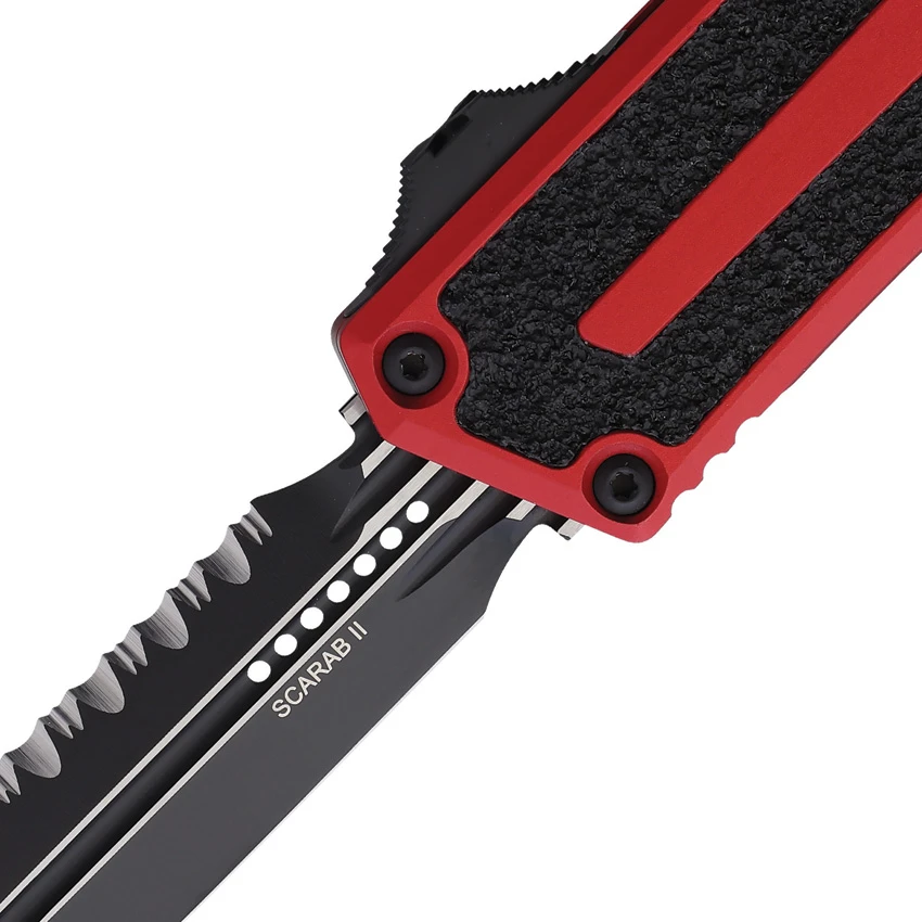 Automatic opening. 5.75″ (14.61cm) closed. 3.9″ (9.91cm) two-tone finish partially serrated premium steel dagger blade. Red aluminum handle with black traction insert. Glass breaker. Lanyard hole. Pocket clip. Double edge blade. Boxed.